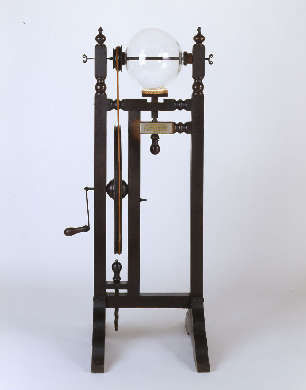 | Electrical Machine, ca. 1742-1747, designed by Benjamin Franklin. Walnut, glass, iron, and leather. 59" x 28" x 24" Library Company of Philadelphia, Gift of Benjamin Franklin Bache, 1792. |
